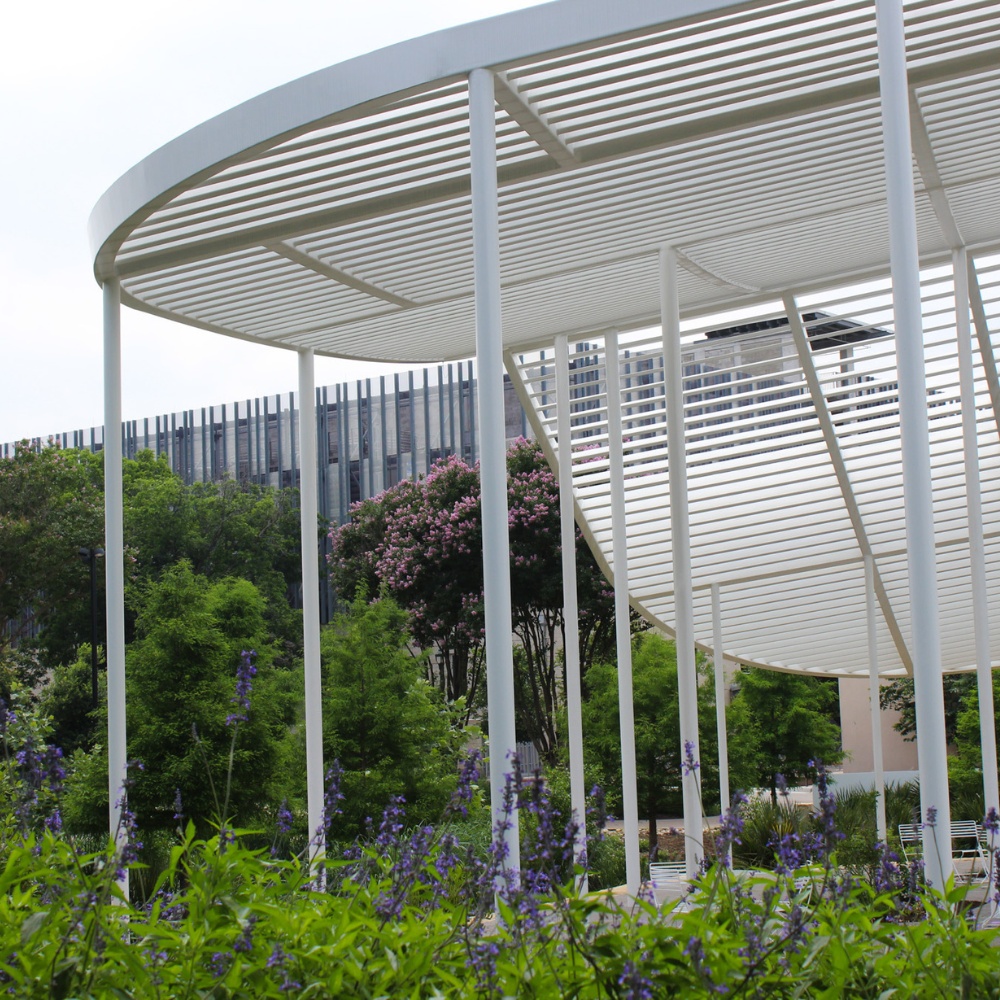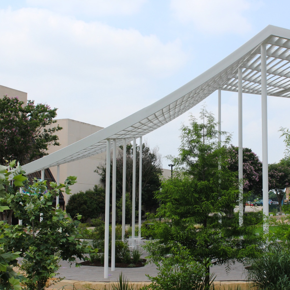 While creating a design for a new pavilion for Highland to be featured at Austin Community College, Harvey Builders recommended Renfrow+Co to be the fabricator on the project. To win the spot, our team interviewed with Austin Community College, Agenda Architecture, and Harvey Builders to see if we would be a good fit. Based on our fervor, ingenuity, and innovative installation concepts, we were chosen to collaborate on the project. Guided by the artistic vision developed by 3D Structural Designer & Detailer, Richard Hood, as well as the collective input of the architects who partnered on the project, our team began translating the pavilion concept into a real-life structure.