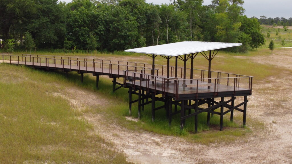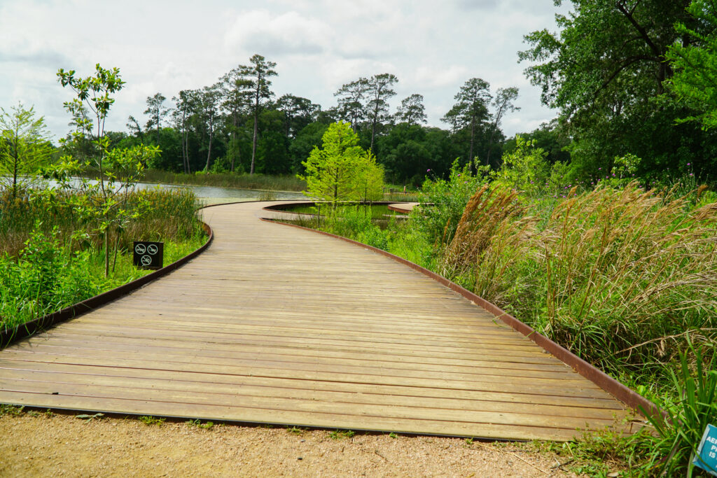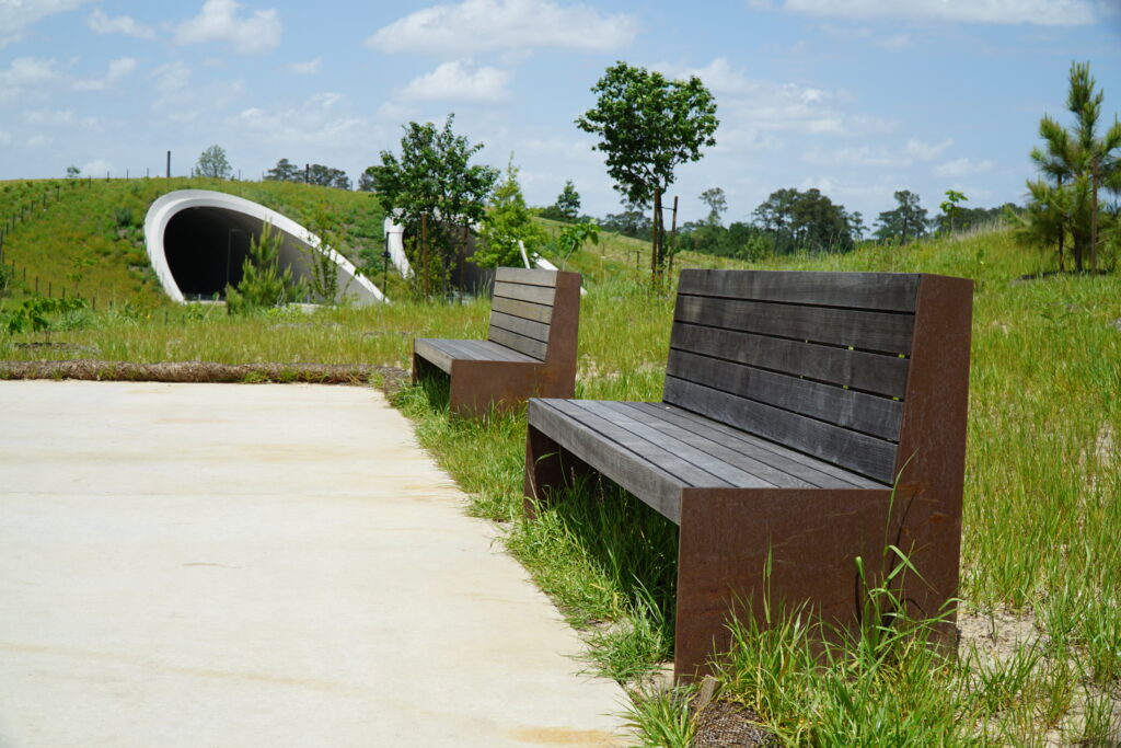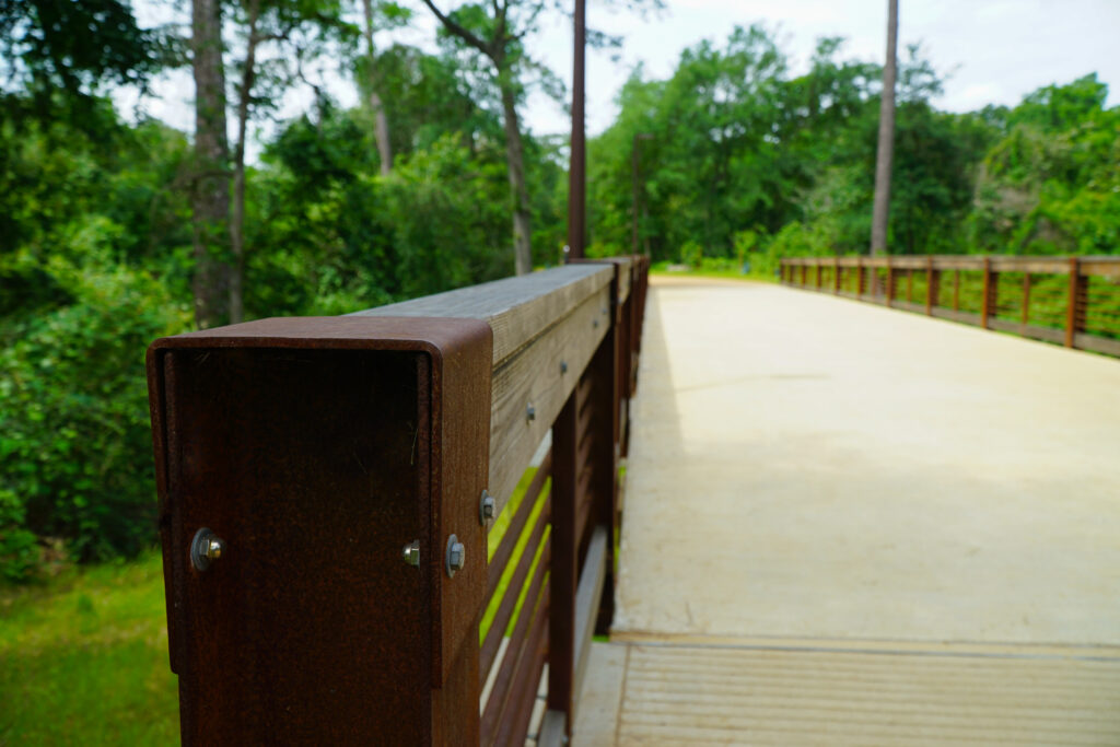 Memorial Park, located within the metro area of Houston, is one of the largest urban parks in the country. It began as a U.S. Army training camp and was converted by the City of Houston in 1924 into a park, dedicated to those that lost their lives in World War I. Tellepsen and Memorial Park Conservancy entrusted us with many projects within the park, including custom furniture made of imported Thermory Ash and White Oak woods. Additionally, we were tasked with fabricating items using Corten steel and semi-timber logs from the park, bronze railings, galvanized custom light poles, a curved bench and more.