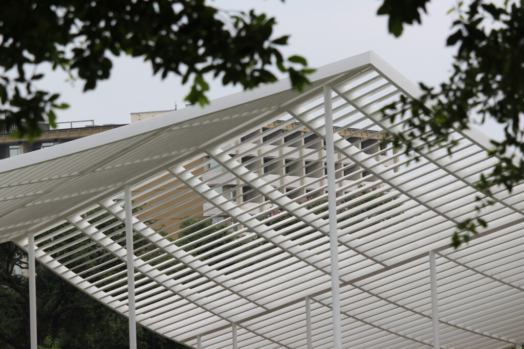 In collaboration with 3D Structural Designer/Detailer Richard Hood, along with the collective input of the architects who partnered on the project, we began translating the pavilion concept into a real-life structure. The pavilion was made up of 150,000 pounds of meticulously forged structural steel; its distinctive character was further enhanced by custom louvers, sourced directly from a mill, and a white paint finish. Once each piece of the pavilion was fabricated, the challenge of transporting items from our Houston headquarters to Austin began. Our team utilized a strategy that had initially captured our collaborators’ attention: the use of a police escort to transport five partially constructed pieces of the pavilion to Austin, and complete installation once everything arrived.