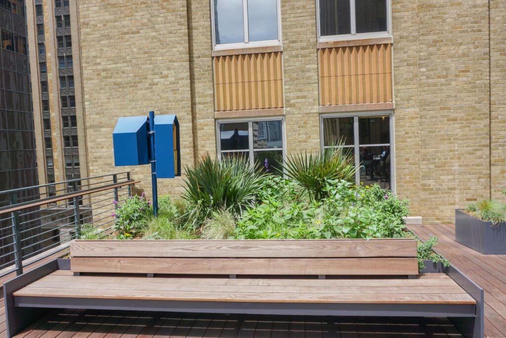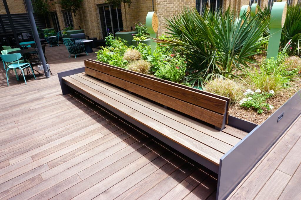 Constructed from plasma-cut carbon steel, extensive lengths of metal were assembled, creating a complex puzzle that formed a structural framework for the new deck. Integrated Thermory Ash benches added a distinctive touch while providing seating for SWA team members. Installing these hefty modules correctly within the tight corners of the space required crane installation; our team’s precision during this process ensured each piece safely found its rightful place.