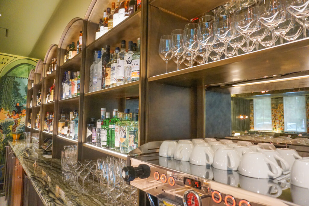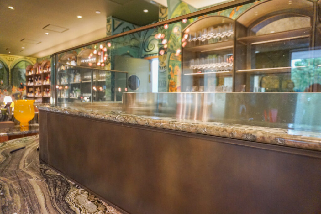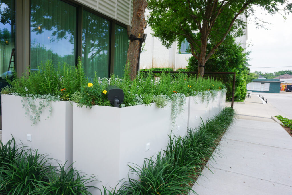 The final result was a stunning modular brass shelving system with integrated lighting and a patina finish to ensure longevity. We selected and sourced the finest materials to match the restaurant’s high standards. Additionally, we created planters for the entrance and outdoor seating area so guests can enjoy Montrose views while waiting. Although outdoor items like planters are our bread and butter, the opportunity to create fine art pieces for an indoor setting excited our team.